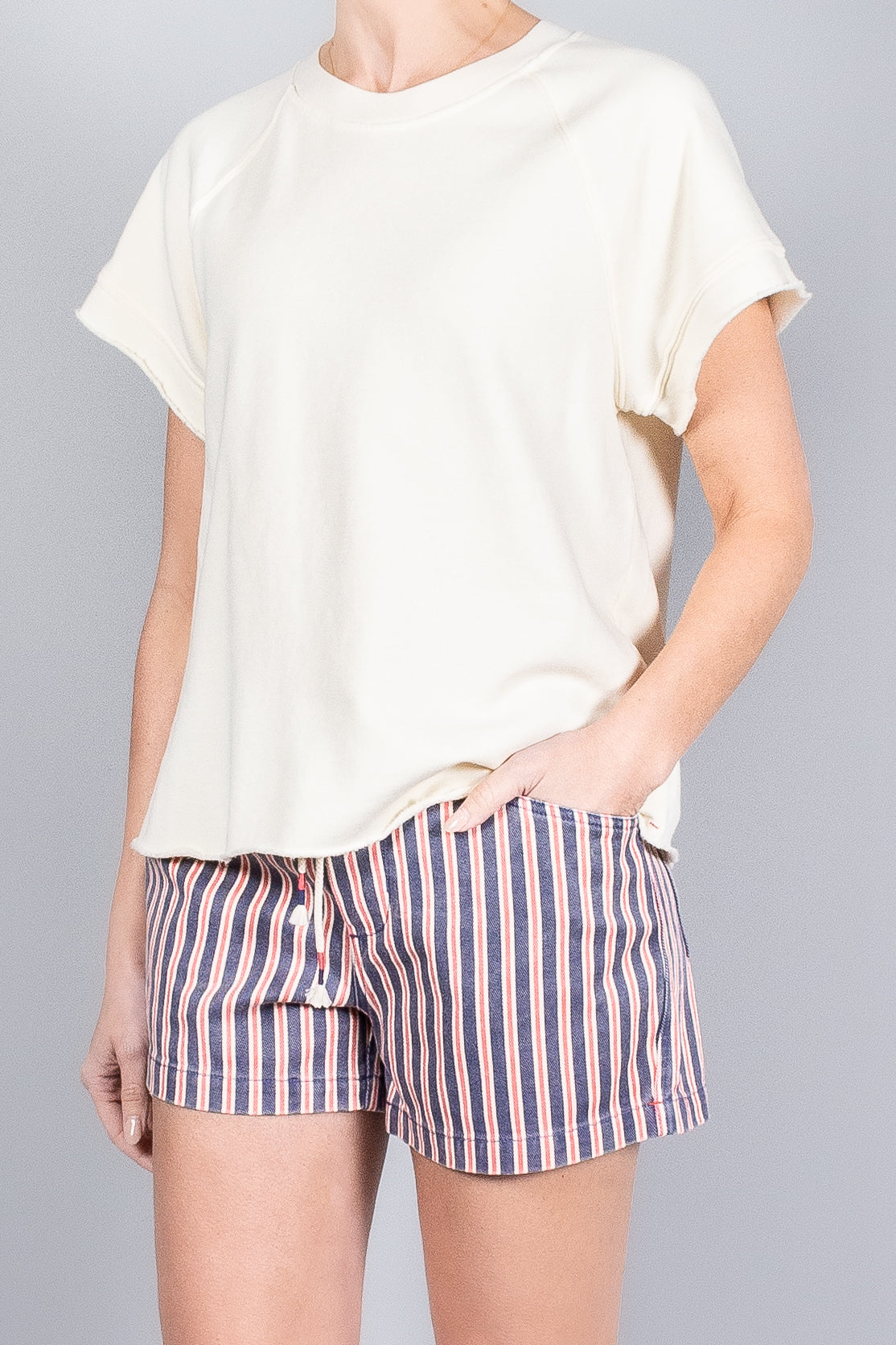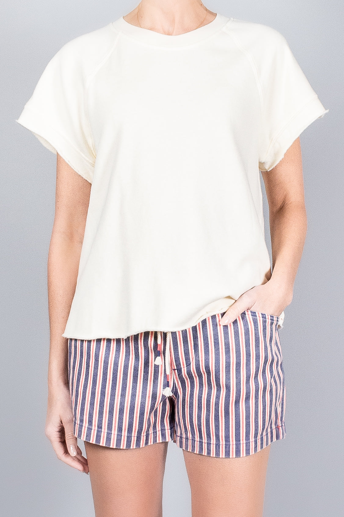 - Short cap sleeves with raw edge